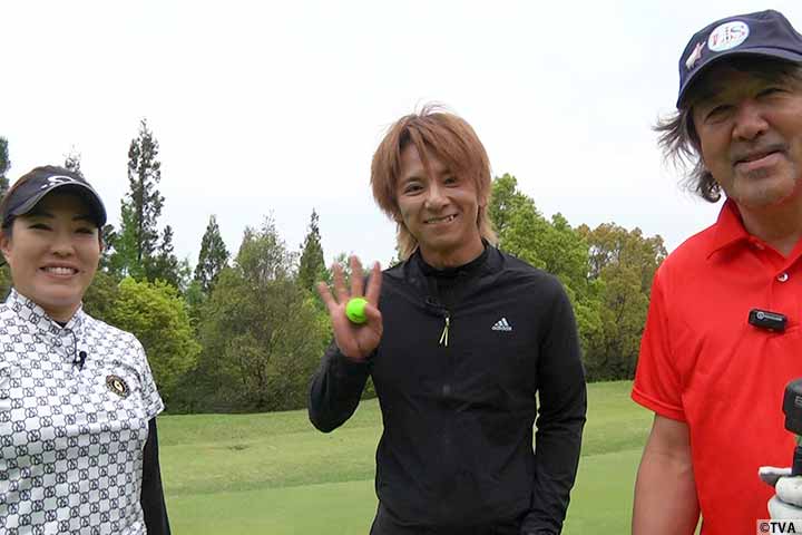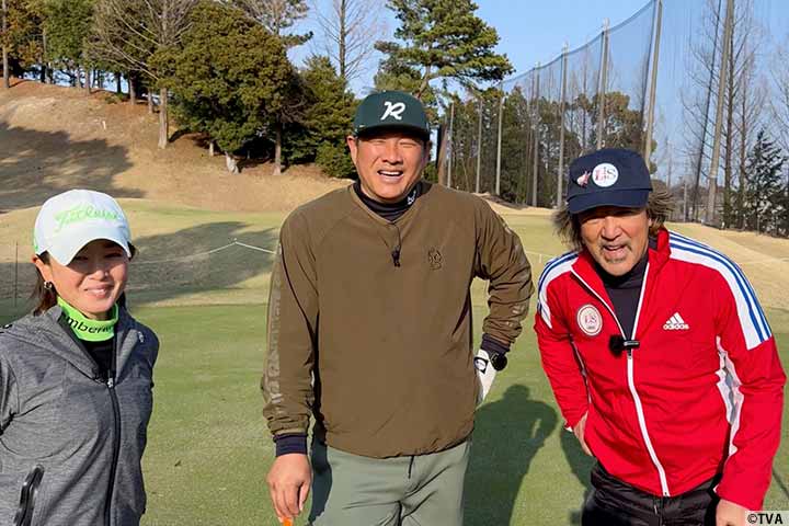 山﨑武司さん、国本百恵プロと一緒にドローボールの打ち方などをレッスン。