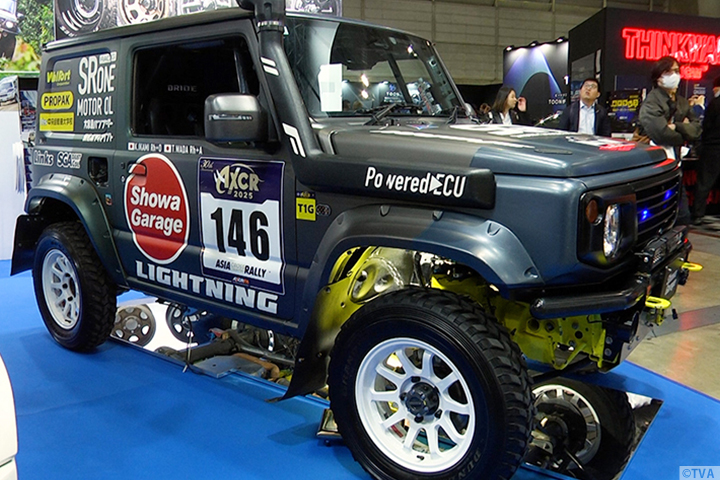 ジムニーに特化したプロショップ・ショウワガレージブースでは、Jimny NOMADE Outdoor Style、アジアクロスカントリーラリー2025に初参戦のrally car AXCR2025 ジムニーシエラをご紹介。