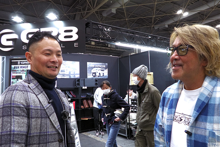 VALENTI JAPANブースでは堀社長とハイエース用新作テールランプや、新型アルファード/ヴェルファイア用のテールランプなどを愉快にご紹介。