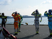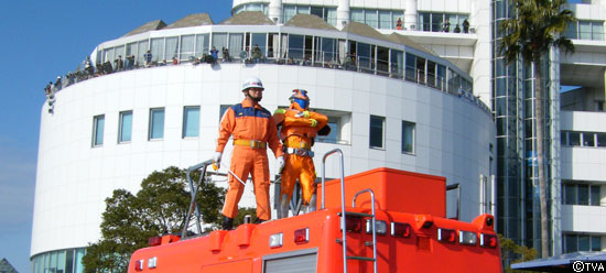 隊列を組んだ消防車のパレードに、消防艇・消防ヘリコプターのデモンストレーション。大迫力のお披露目に続いて登場したのは真っ赤なスポーツカー。そう、ダッシュ1です。観閲台の前で運転席のドアを開け、ファイアー1が敬礼。会場は子供たちの大歓声に包まれました。サプライズは、レスキューファイアーの特別参加!ここからドラマ仕立てで出初式の目玉、消防訓練が始まりました。