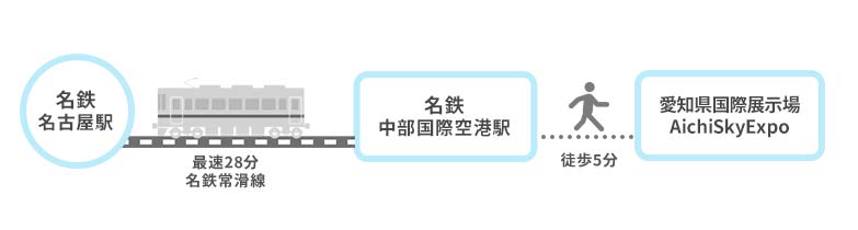 電車でお越しの場合は名鉄常滑線をご利用ください。(ミュースカイ特急は最速28分で名鉄名古屋から最寄り駅の名鉄中部国際空港駅に着きます。)