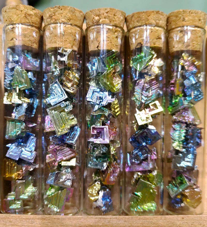 | 内容 | ビスマスという金属は、高温で融かして再結晶することで不思議な色と形の結晶が生成します。石華工匠は2007年よりこれを製造してきました。ビスマス結晶は非常に柔らかく脆い物質なので、主に瓶に固定して扱いやすくした状態で販売しています。 |