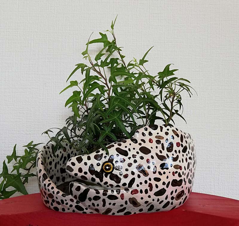 鳥や昆虫、哺乳類のイラストをTシャツや小物にしています。粘土で魚や哺乳類の器を作っています