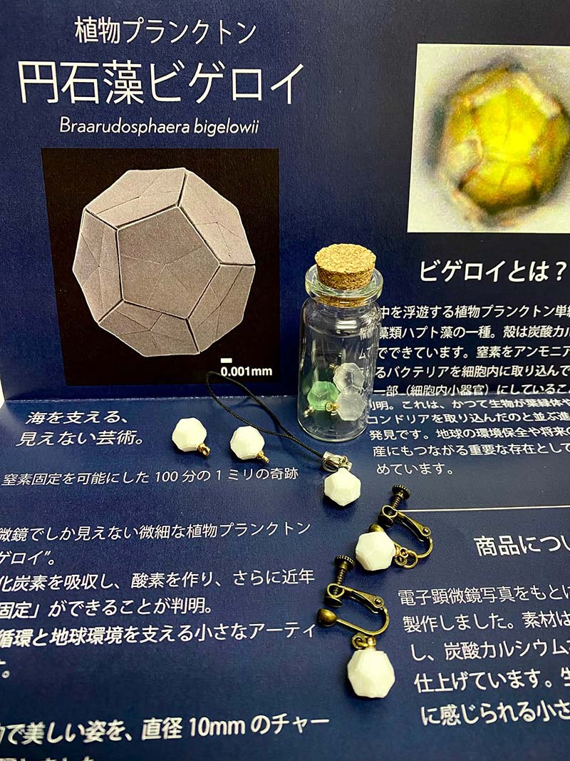 | 内容 | 植物プランクトン円石藻ビゲロイを電子顕微鏡写真を元に3Dプリンターで再現。直径1cmのチャームと10cmのライトカバーを販売します。 |